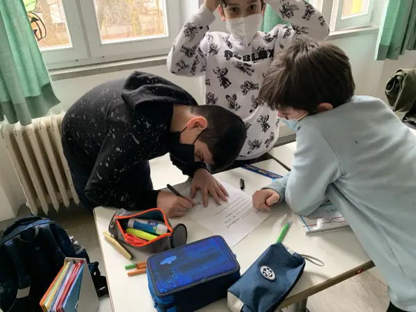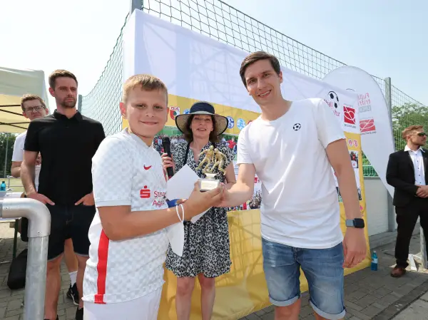 Zu guter letzt schenkten die Kinder Noah ein Exemplar des für den Lese-Kicker 2022 nominierten Buches „Der Himmel über dem Platz“, welches die Kinder selbst im Rahmen von FtK lesen durften. Natürlich durften sich die Kinder am Ende gemeinsam mit Noah ablichten lassen und sich ein Autogram abholen. So konnten die Kinder ihr eigenes Erinnerungsstück an diesen besonderen Tag mit nach Hause nehmen.