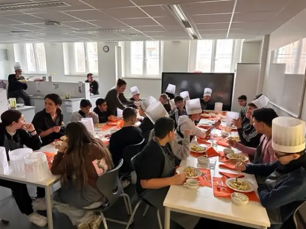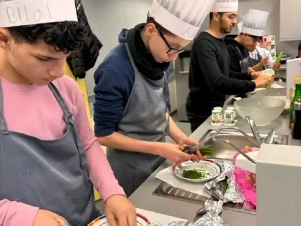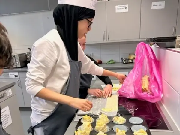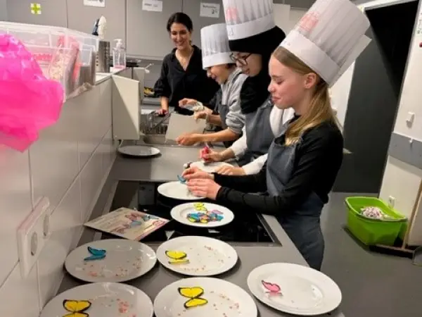After putting on their chef’s hats and tying their aprons, the pupils were divided into two groups. One group was responsible for the main course, the other for the dessert, with Ms. van der Leyen explaining the procedure in an age-appropriate way. They cooked, baked, set tables, ate and, of course, tidied up together. It was a successful afternoon with penne and homemade green pesto, cucumber salad and puff pastry rolls with vanilla ice cream.