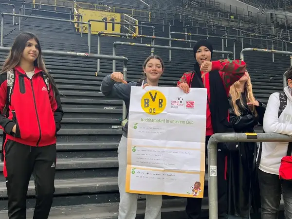 The children from the Anne Frank School in Dortmund explored many questions, focusing in particular on energy-saving measures and possible emission factors. How is waste actually disposed of? What is done with the leftover food? How much electricity is consumed on a match day? And what happens to the used jerseys?