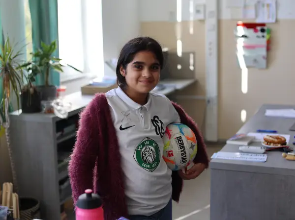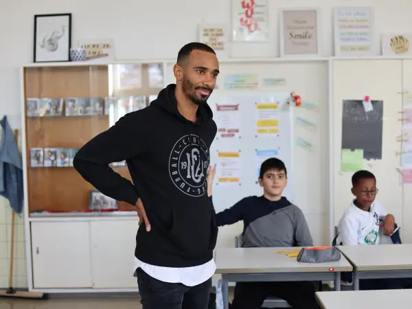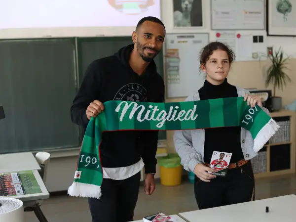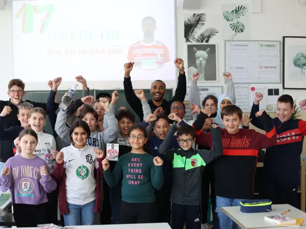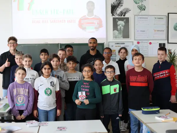 „Fußball begeistert und kann so vieles von dem vermitteln, was Kinder fürs Leben brauchen: Mannschaftsgeist, soziale Kompetenzen, Einsatz und Fairplay. Als Pate für „Fußball trifft Kultur“ möchte ich die Kinder in ihrer Entwicklung begleiten“, sagte Noah Sarenren Bazee und hörte beim Klassenbesuch den Fragen der Kinder ganz genau zu. Dabei gab Noah spannende Einblicke in seine Entwicklungsphasen als Profifußballer und vermittelte den Kindern, dass man auch in schwierigen der scheinbar aussichtslosen Situationen niemals aufgeben solle.