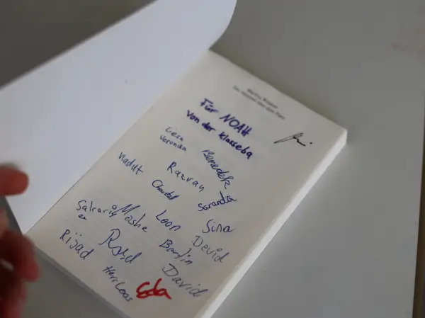 Zu guter letzt schenkten die Kinder Noah ein Exemplar des für den Lese-Kicker 2022 nominierten Buches „Der Himmel über dem Platz“, welches die Kinder selbst im Rahmen von FtK lesen durften. Natürlich durften sich die Kinder am Ende gemeinsam mit Noah ablichten lassen und sich ein Autogram abholen. So konnten die Kinder ihr eigenes Erinnerungsstück an diesen besonderen Tag mit nach Hause nehmen.